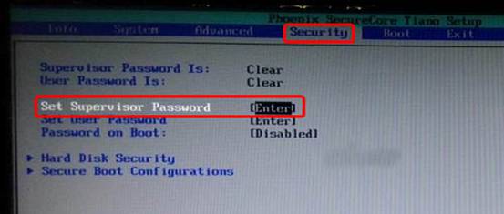 2、左右移动,进入Security菜单,将Set Supervisor Password设置上一个密码。