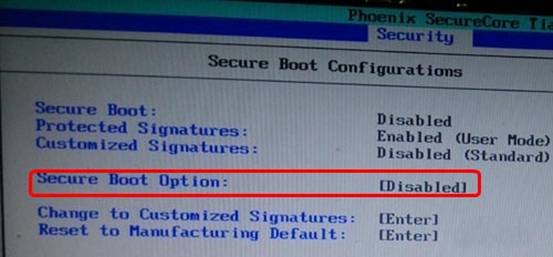 4、进入Security菜单下面的Secure Boot Configurations,禁用secure Boot Option(Disabled)